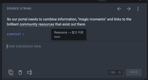 • First, when you find an underlined term on the source string, you can mouse over and see a brief definition of it.